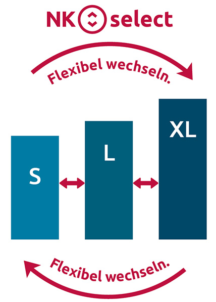Passt sich dem Leben an: Mit dem ganzheitlichen Tarifkonzept NK.select und seiner Wechseloption NK.select FLEX bieten wir die Möglichkeit, zu vielen verschiedenen Zeitpunkten oder Ereignissen das Absicherungsniveau zu erhöhen. Entweder durch einen Wechsel innerhalb unserer drei NK.select-Tarife S, L und XL und/oder durch Herabsetzen des gewählten Selbstbehalts. Und wer seinen Versicherungsschutz reduzieren möchte, kann später wieder in den davor bestehenden Tarif zurückwechseln. Ganz einfach und ohne erneute Gesundheitsprüfung!